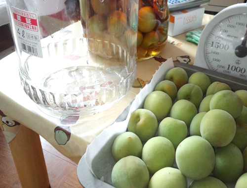 あとは梅のへたとって洗って、一日そこら渇かして、あとは酒と砂糖に漬けるだけ。