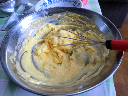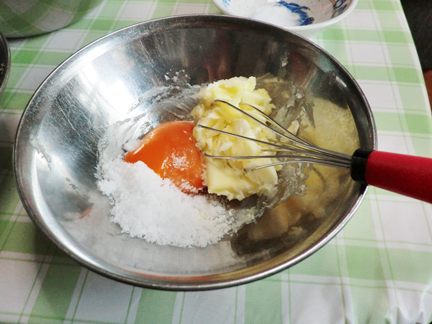 で、そうしている間にバターが柔らかくなるので、卵黄・砂糖と一緒にクリーム状になるまで混ぜる。