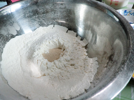 混ざったら強力粉・薄力粉とドライイーストを合わせたところに投入。
