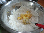 室温に戻しておいた牛乳を少しずつ加えながら、粉っぽさがなくなるまで纏めます。