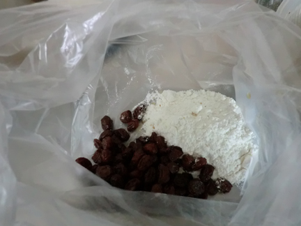 ラム漬けレーズンだとどれだけ水分を切っても生地と混ざり難いので、強力粉をまぶします。